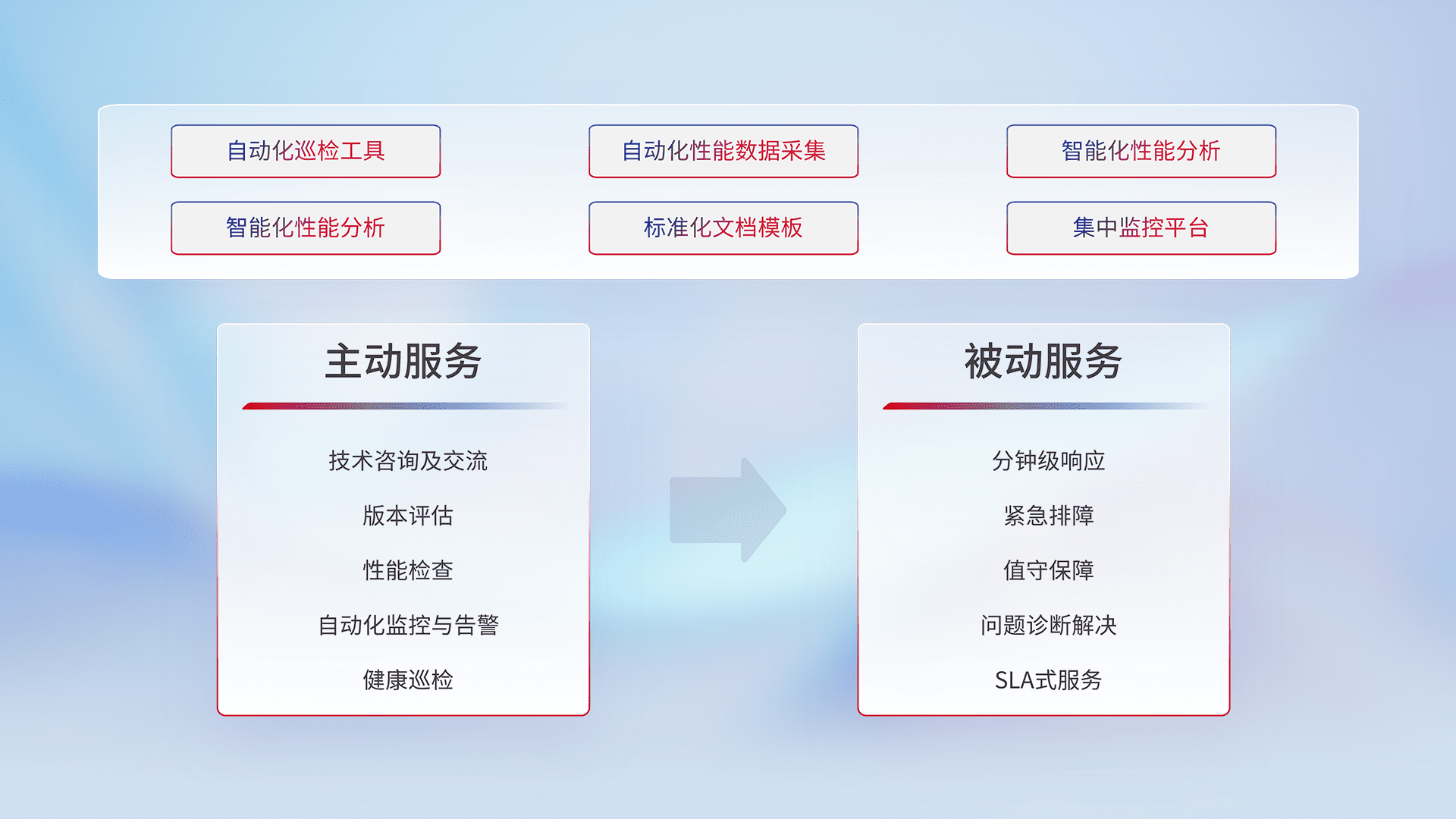 智能化工具和标准化文档,,,保障服务质量,,,,提供主动服务(包含技术咨询、、、版本评估、、性能检查、、、自动化监控与告警、、、、健康巡检)和被动服务包含(分钟级响应、、紧急排障、、、、值守保障、、、问题诊断解决、、、SLA服务)。。